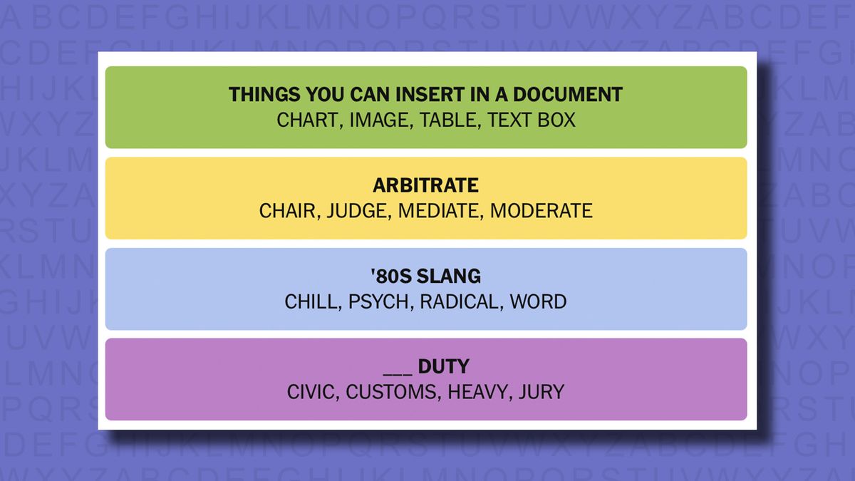 New Connections is one of several increasingly popular word games made by the New York Times. It challenges you to find groups of four objects that share something in common, and each group has another level of difficulty: green is light, yellow a little harder, blue often quite hard and purple usually very difficult.