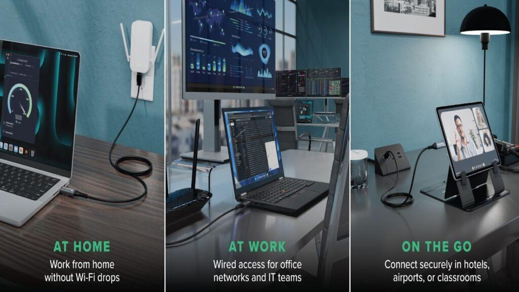 It is designed to connect smartphones and tablets to wired Ethernet networks that offer a more stable connection to network storage systems or work with NAS devices.