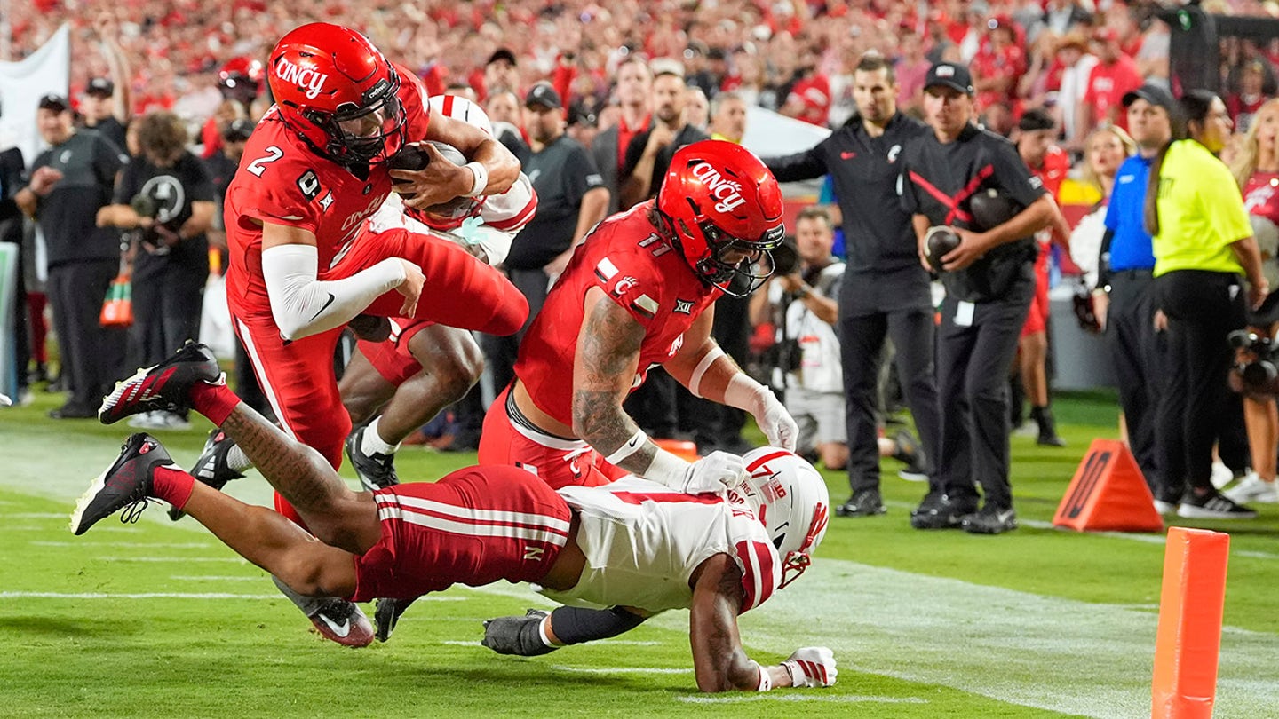 Cincinnati Quarterback Brendan Sorsby (2) skips Nebraska Defensive Back Malcolm Hartzog Jr. (7) To score a touchdown in the second half of a NCAA College -Football match on Thursday, August 28, 2025 at Arrowhead Stadium in Kansas City, Missouri. (AP Photo/Charlie Riedel)