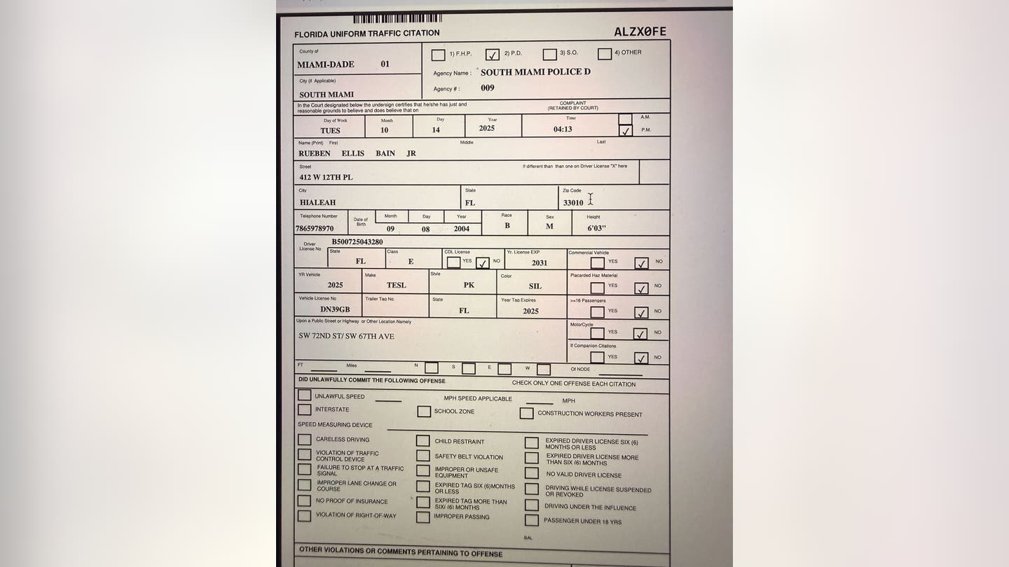 In addition to the March 2024 crash, court records show that Bain Jr. was issued a citation on October 10, 2025, driving a 2025 Tesla Cybertruck, in which he was again charged with careless driving. The citation, shown below, shows a violation of Florida statute 316.1925(1), which is careless driving.