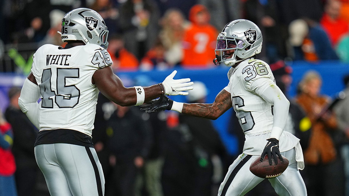 Las Vegas Raiders cornerback Kyu Blu Kelly (36) is congratulated by teammate Devin White (45) after intercepting a pass during the first half of an NFL football game against the Denver Broncos, Thursday, Nov. 6, 2025, in Denver. (AP Photo/Jack Dempsey)