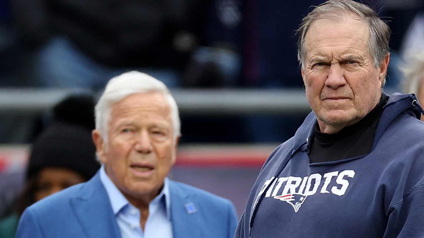 New England Patriots owner Robert Kraft, Left, and head coach Bill Belichick looks at from the sidelines before the game against Kansas City Chiefs at Gillette Stadium on December 17, 2023 in Foxborough, Massachusetts. (Maddie Meyer/Getty Images)