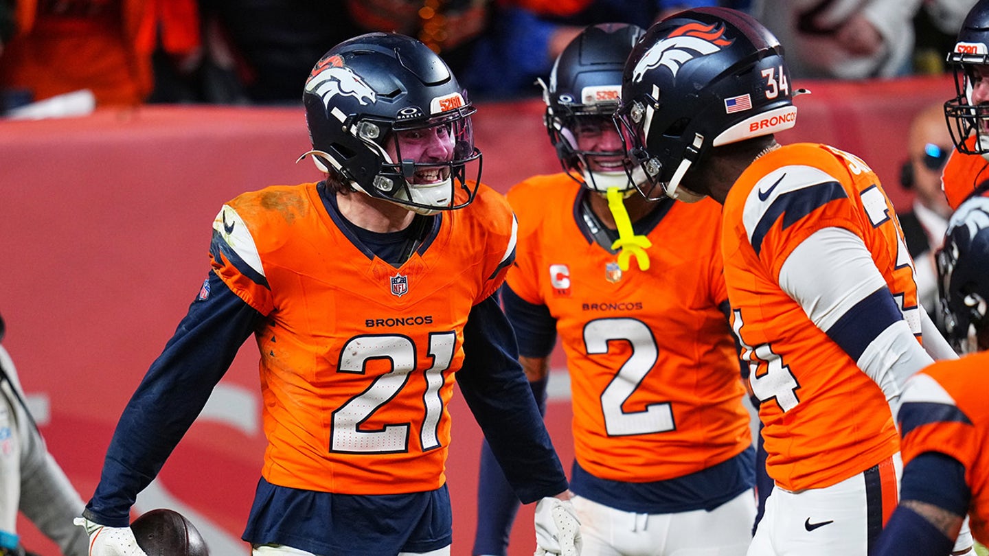Denver Broncos’ Riley Moss celebrates an interception during the second half of an NFL football game against the Green Bay Packers, Sunday, Dec. 14, 2025, in Denver. (AP Photo/Jack Dempsey)