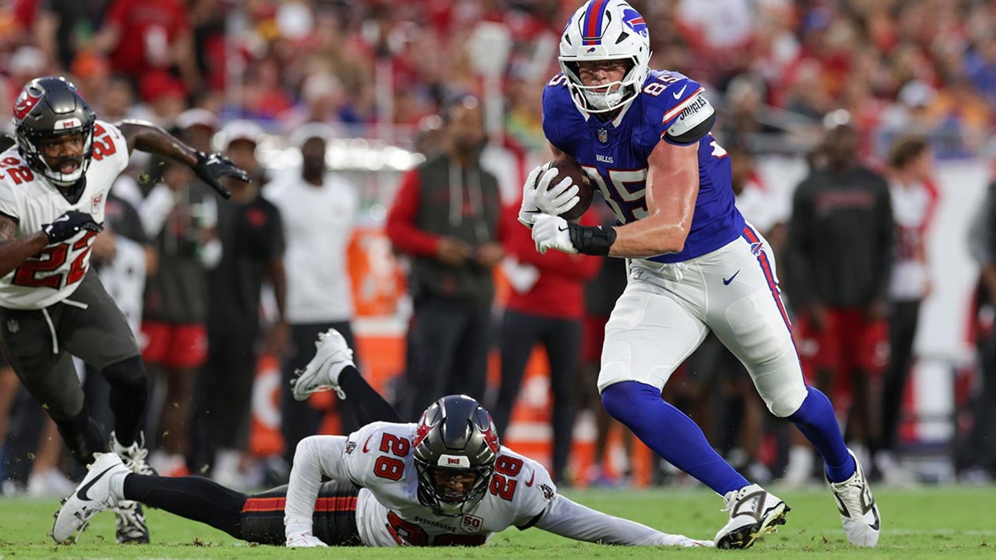 Buffalo Bills Tight End Jackson Hawes (85) runs past Tampa Bay Buccaneers Safety Shilo Sanders (28) in the first quarter at Raymond James Stadium. (Nathan Ray Seebeck/Imag- Pictures)