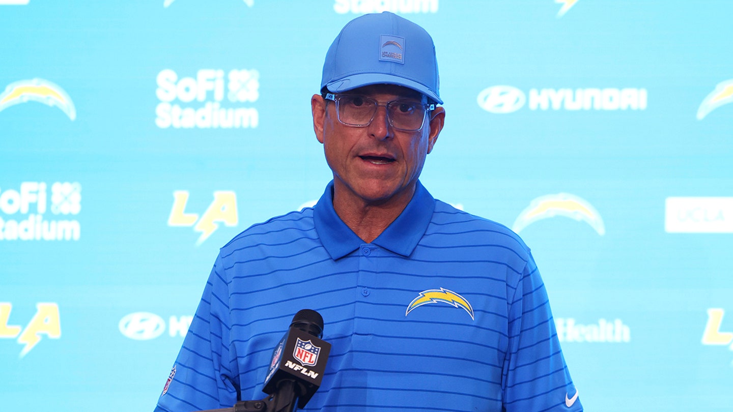 Charger’s principal coach Jim Harbaught speaks at a news conference after the Rams game, Saturday 16 August 2025. (AP Photo/Jessie Alcheh)