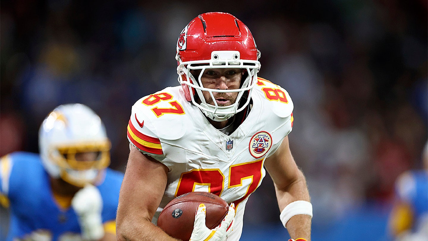 Kansas City Chiefs Tight End Travis Kelce knees after a NFL football match between Kansas City Chiefs and Los Angeles Chargers in Sao Paulo on September 6, 2025. (AP Photo/Fernando Llano)