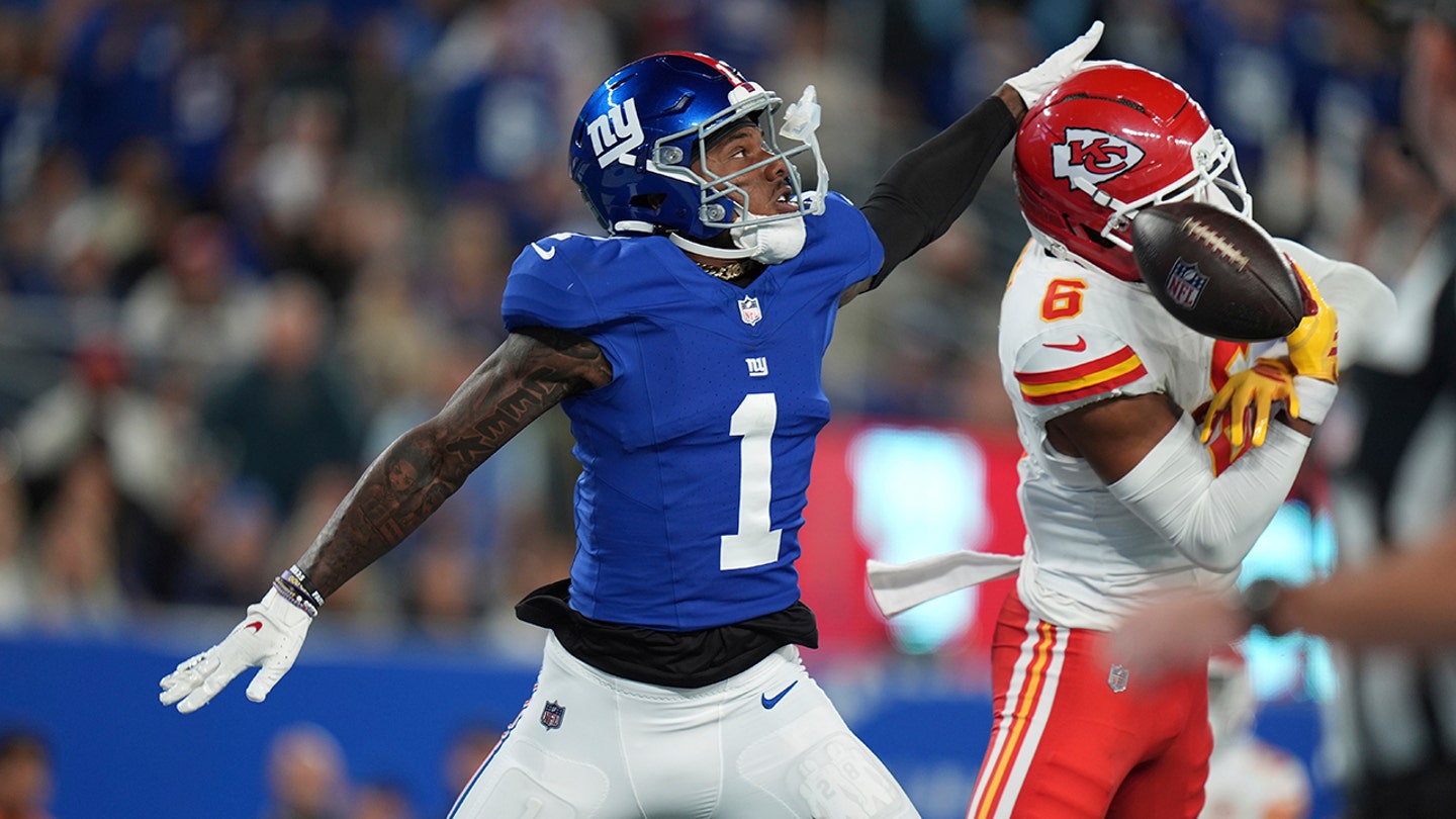 Kansas City Chiefs Safety Bryan Cook (6) breaks a passport intended for New York Giants Wide Receiver Malik Nabers (1) during the second half of a NFL football match on Sunday 21 September 2025 in East Rutherford, New Jersey. (AP Photo/Seth Wenig)