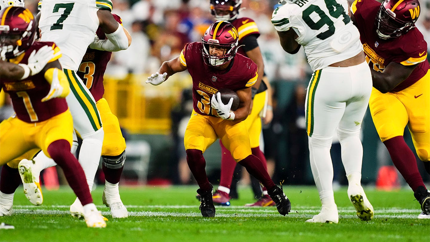 Austin Ekeler (30) from the Washington commanders carry the ball against Green Bay Packers during a NFL football match at Lambeau Field in Green Bay, Wisconsin, on September 11, 2025. (Cooper Neill/Getty Images)