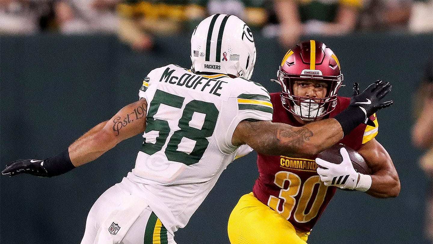 Washington commanders who run back Austin Ekeler (30) Stiff-Arms Green Bay Packers Linebacker Isaiah McDuffie (58) at Lambeau Field in Green Bay, Wisconsin, September 11, 2025. (Tork Mason/USA Today Network-Wisconsin)
