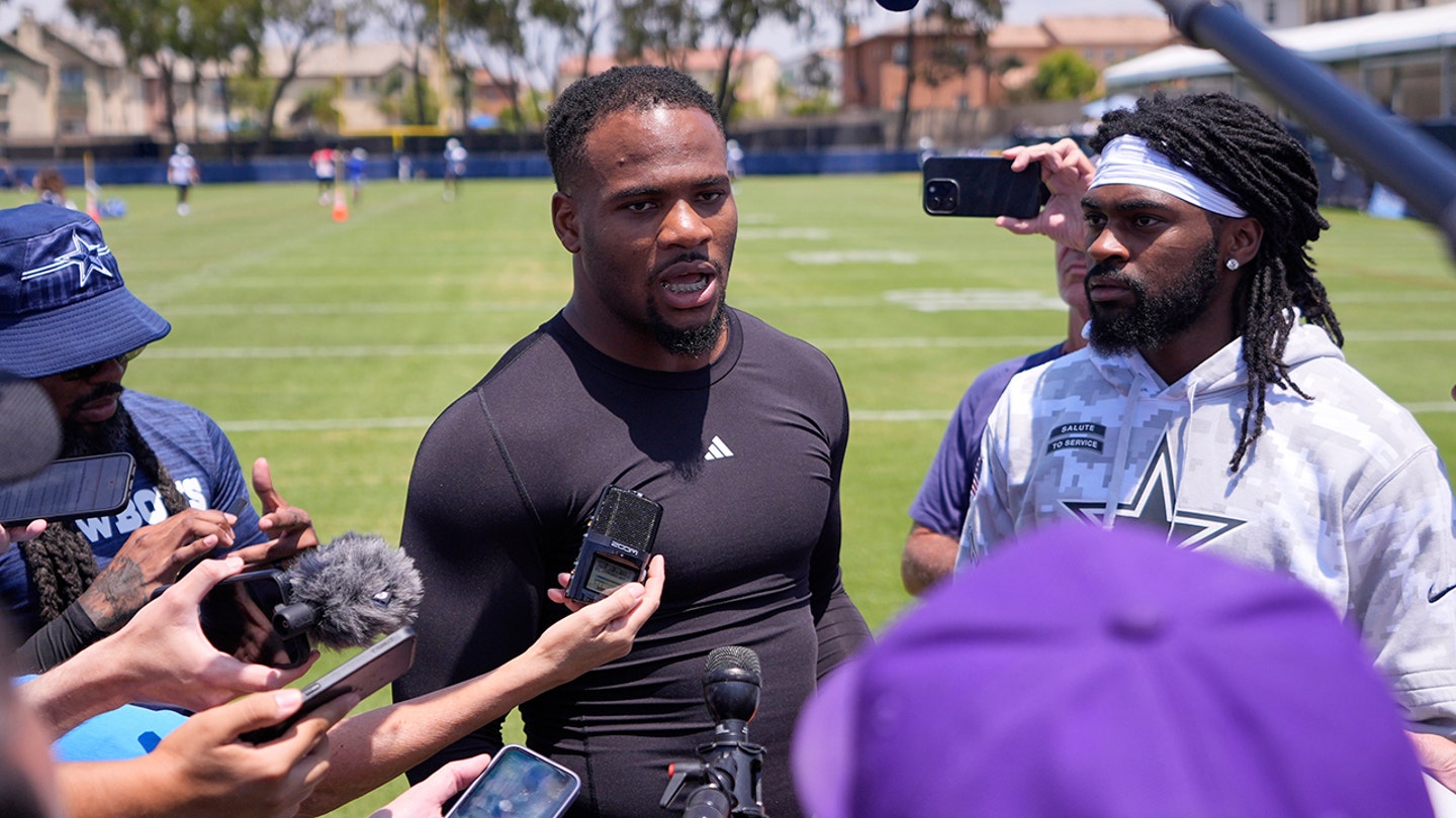 Dallas Cowboys defensive than Micah Parsons speaks to journalists after training camp on Tuesday, July 22, 2025 in Oxnard, California. (AP Photo/Mark J. Terrill)