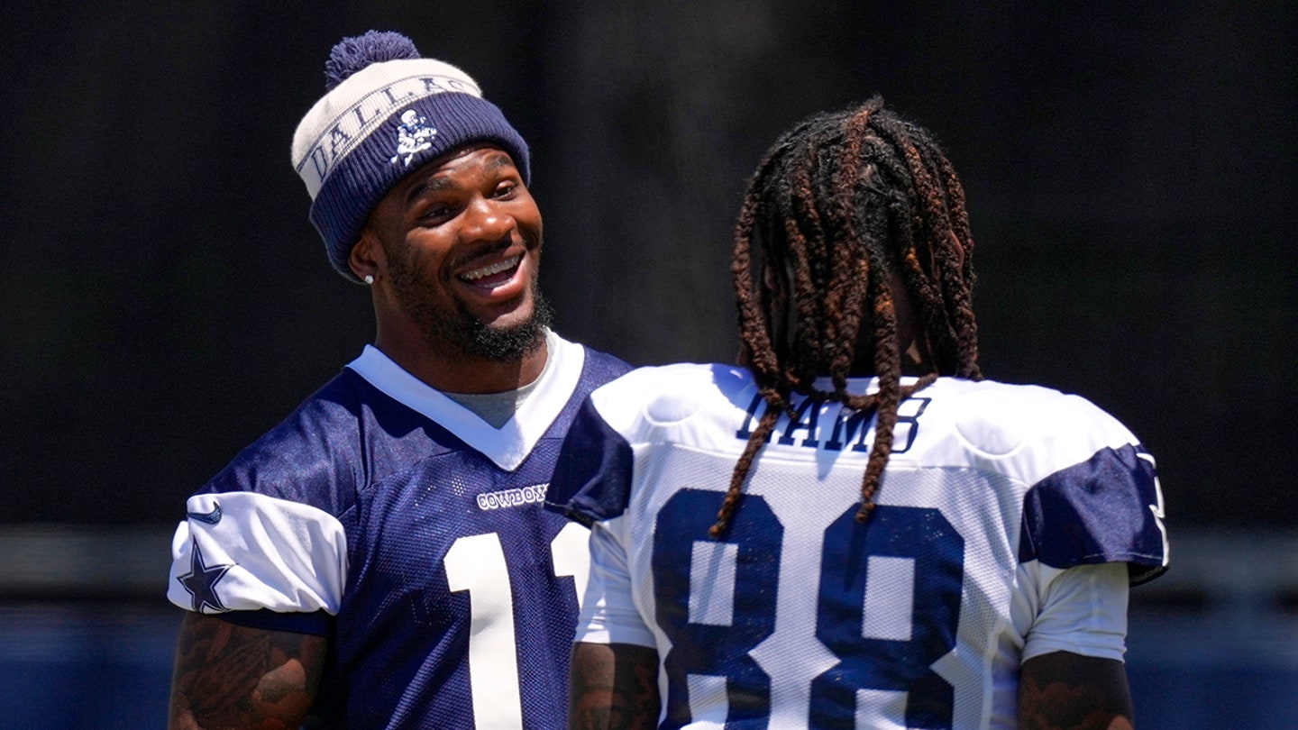 Dallas Cowboys defensive than Micah Parsons, Left, speaks to the broad recipient Ceedee Lamb during training camp July 31, 2025, in Oxnard, California. (AP Photo/Mark J. Terrill)