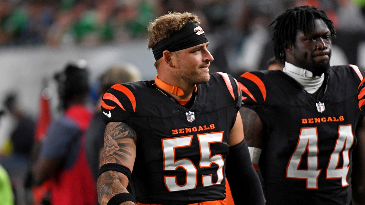 Logan Wilson (55) of the Cincinnati Bengals watches from the sideline during the national anthem prior to an NFL football game against the Pittsburgh Steelers at Paycor Stadium in Cincinnati, Ohio on October 16, 2025. (Cooper Neill/Getty Images)