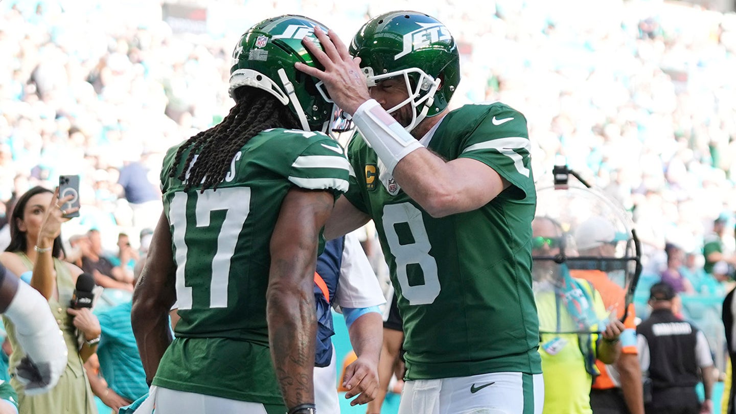 New York Jets Quarterback Aaron Rodgers and the broad recipient Davante Adams celebrate a touchdown against Dolphins, December 8, 2024, in Miami Gardens, Florida. (AP Photo/Lynne Sladky)