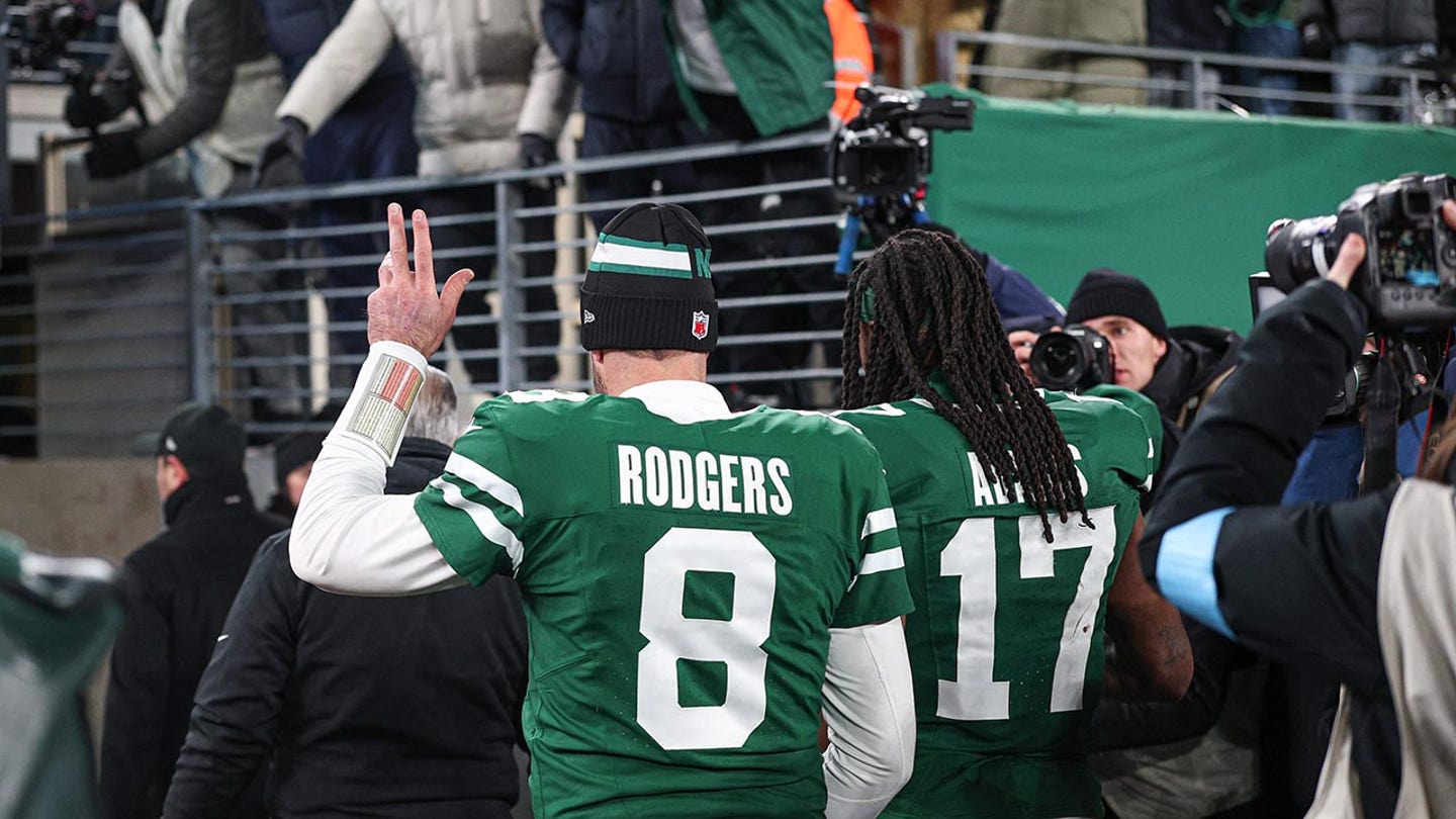 The New York Jets Wide Receiver Davante Adams and Quarterback Aaron Rodgers are getting ready to get off the field at Metlife Stadium, January 5, 2025, in East Rutherford, New Jersey. (IMagn)