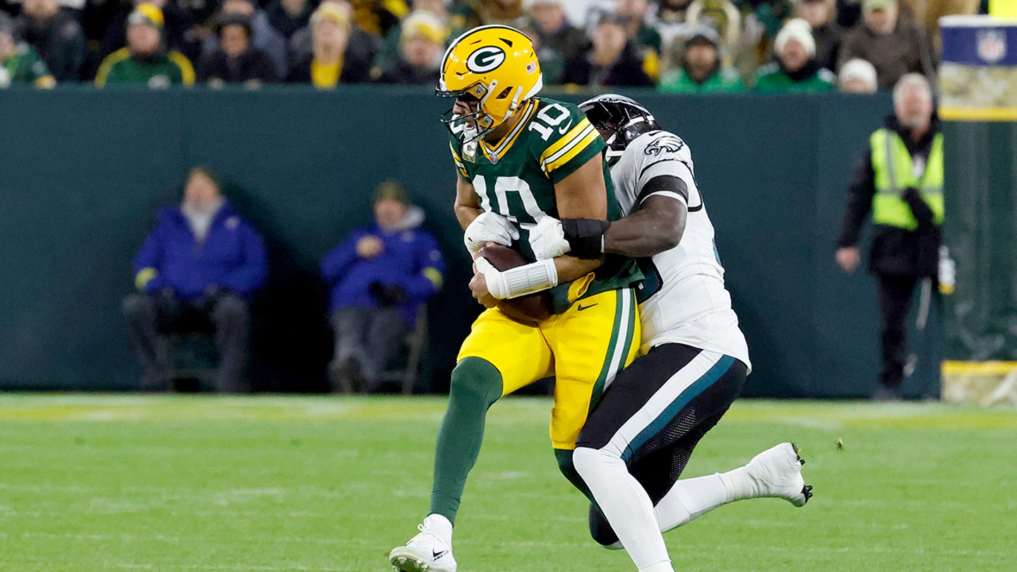 Philadelphia Eagles linebacker Jalyx Hunt (58) sacks Green Bay Packers quarterback Jordan Love (10) during the first half of an NFL football game in Green Bay, Wis., on Nov. 10, 2025. (Mike Roemer/AP Photo)