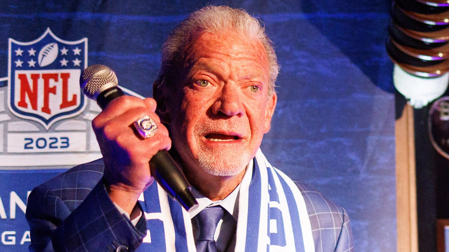 Indianapolis Colts owner Jim Irsay speaks during the Indianapolis Colts Ring of Honor ceremony for Tarik Glenn during halftime of a game against the Washington Commanders at Lucas Oil Stadium on Oct. 30, 2022, in Indianapolis. (Justin Casterline/Getty Images)