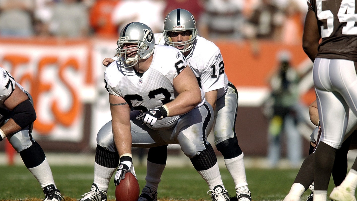 Center Barret Robbins (63) of the Oakland Raiders is set to snap the ball to quarterback Rich Gannon (12) during a game against the Cleveland Browns at Cleveland Browns Stadium in Cleveland October 12, 2003. (David Maxwell/Getty Images)