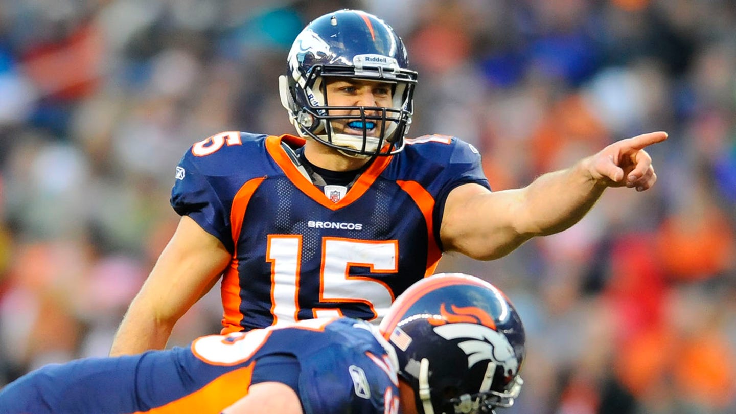 Denver Broncos Quarterback Tim Tebow (15) is moving on the line with a review against Houston Texans in the second half at Inesco Field on December 26, 2010. (Ron Chenoy/USA Today Sports)