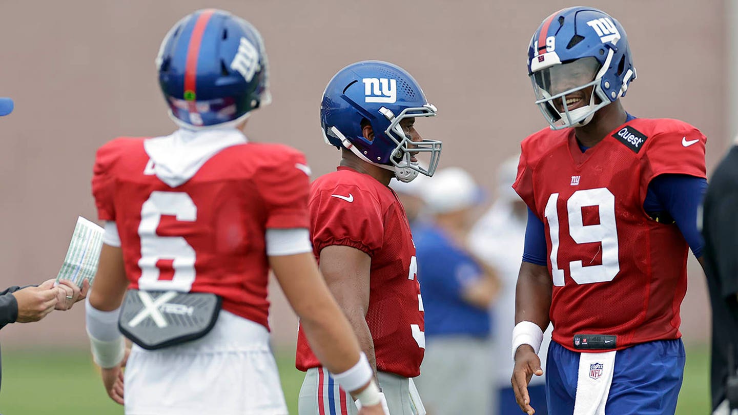 New York Giants Quarterback Jameis Winston (19) responds with Russell Wilson ahead of Jaxson Dart (6) during the back Together Weekend at the team’s NFL Football Training Camp, Sunday 27th July 2025, in East Rutherford, NJ (AP Photo/Adam Hunger)