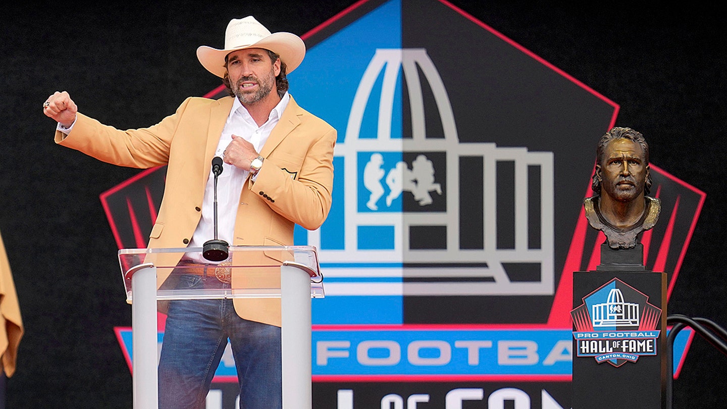 Jared Allen speaks during his induction in Pro Football Hall of Fame, Saturday, August 2, 2025, in Canton, Ohio. (AP Photo/Sue Ogrocki)