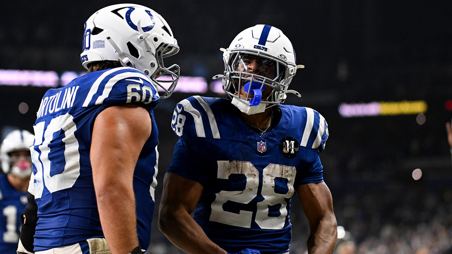 Indianapolis Colts running back Jonathan Taylor (28) celebrates with Indianapolis Colts center Tanor Bortolini (60) after scoring a touchdown during the third quarter against the Tennessee Titans at Lucas Oil Stadium in Indianapolis, Indiana on October 26, 2025. (Robert Goddin/Imagn Images)