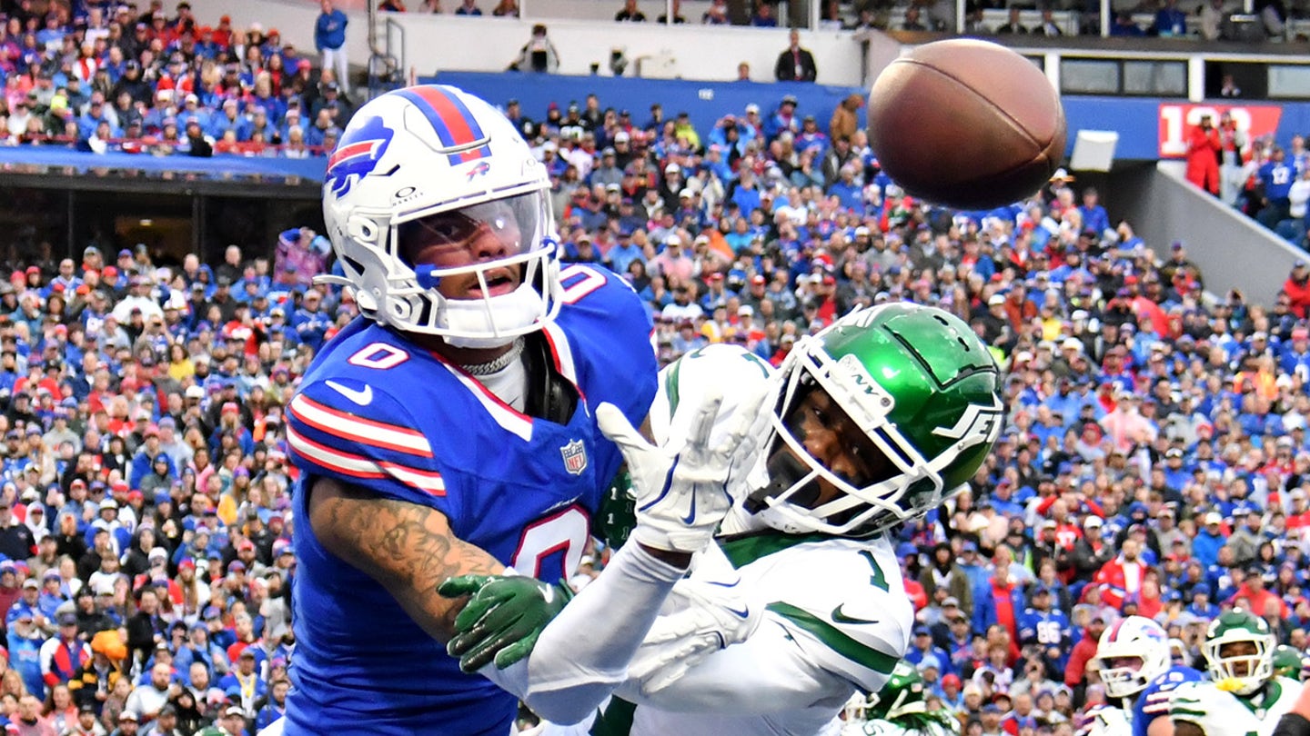 The New York Jets Cornerback Sauce Gardner (1) Breaks a Care in the End Zone intended for Buffalo Bills Broad receives Keon Coleman (0) in the first quarter at Highmark Stadium 29 December 2024, in Orchard Park, new (Mark Kindenzny/Imag- Pictures)