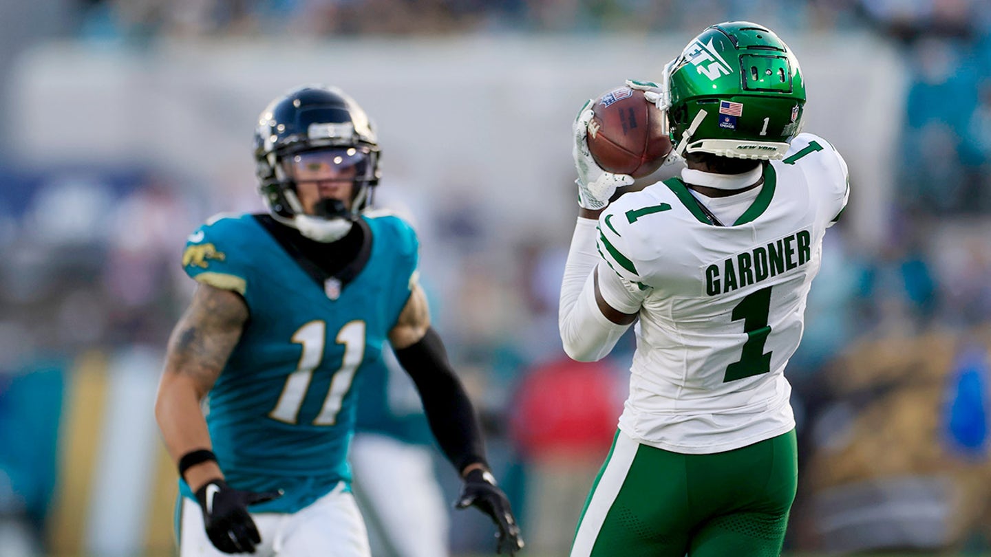 The New York Jets Cornerback Sauce Gardner (1) draws in an interception against Jacksonville Jaguar’s wide receives Parker Washington (11) during the fourth quarter of 15 December 2024, at Everbank Stadium in Jacksonville, Fla. (Corey Perrine/Florida Times-Union)
