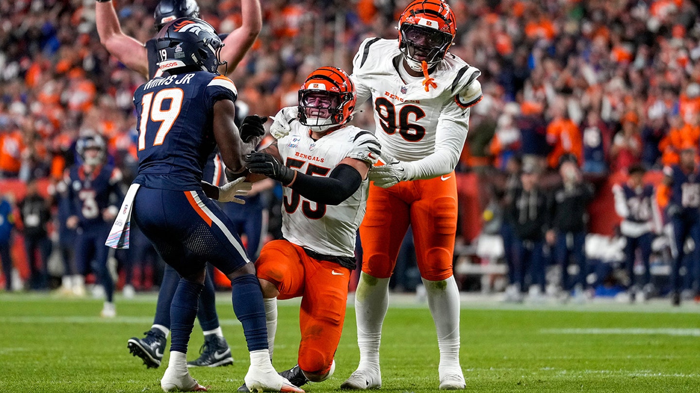 Denver Broncos wide receiver Marvin Mims Jr. (19) helps Cincinnati Bengals linebacker Logan Wilson (55) as he appears to be injured in the fourth quarter of the NFL Week 4 “Monday Night Football” game between the Denver Broncos and the Cincinnati Bengals at Empower Field at Mile High in Denver, Sept. 205, Monday, Sept. 20. (Sam Greene/The Enquirer/USA TODAY NETWORK via Imagn Images)