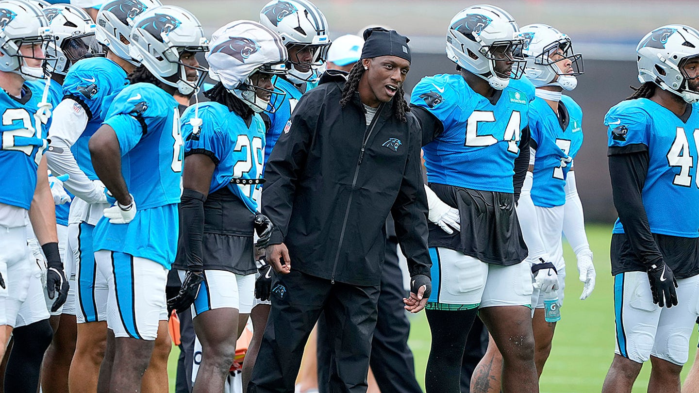 Carolina Panthers Cornerback Jaycee Horn looks under an NFL football dual training camp with Cleveland Browns on Wednesday, August 6, 2025 in Charlotte, NC Horn was involved in a car accident on the way to camp. (AP Photo/Chris Carlson)