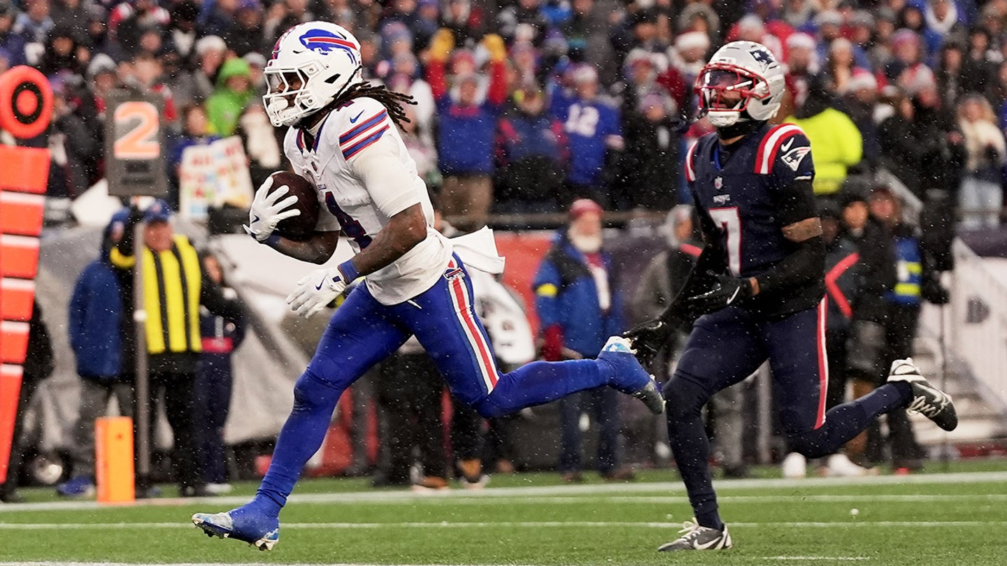 Buffalo Bills running back James Cook III, left, runs past New England Patriots cornerback Carlton Davis III (7) for a score in the second half of an NFL football game in Foxborough, Mass., Sunday, Dec. 14, 2025. (AP Photo/Charles Krupa)