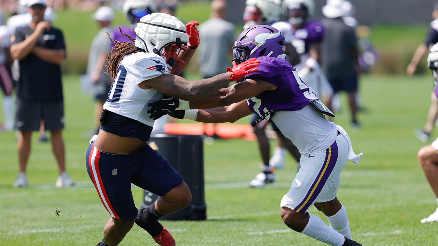New England Patriots Tight End Gee Scott Jr., #80, runs a route while defending by Minnesota Vikings Linebacker Dorian Mausi, #52, during training camp in TCO Performance Center on August 13, 2025 in Eagan, Minnesota. (Bailey Hillesheim/Icon Sportswire via Getty Images)
