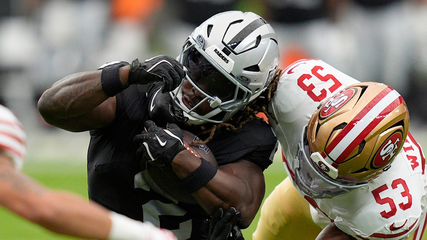 Raiders, which runs back Ashton Jeanty, is tackled by San Francisco 49ers Linebacker Dee Winters on Saturday, August 16, 2025 in Las Vegas. (AP Photo/John Locher)