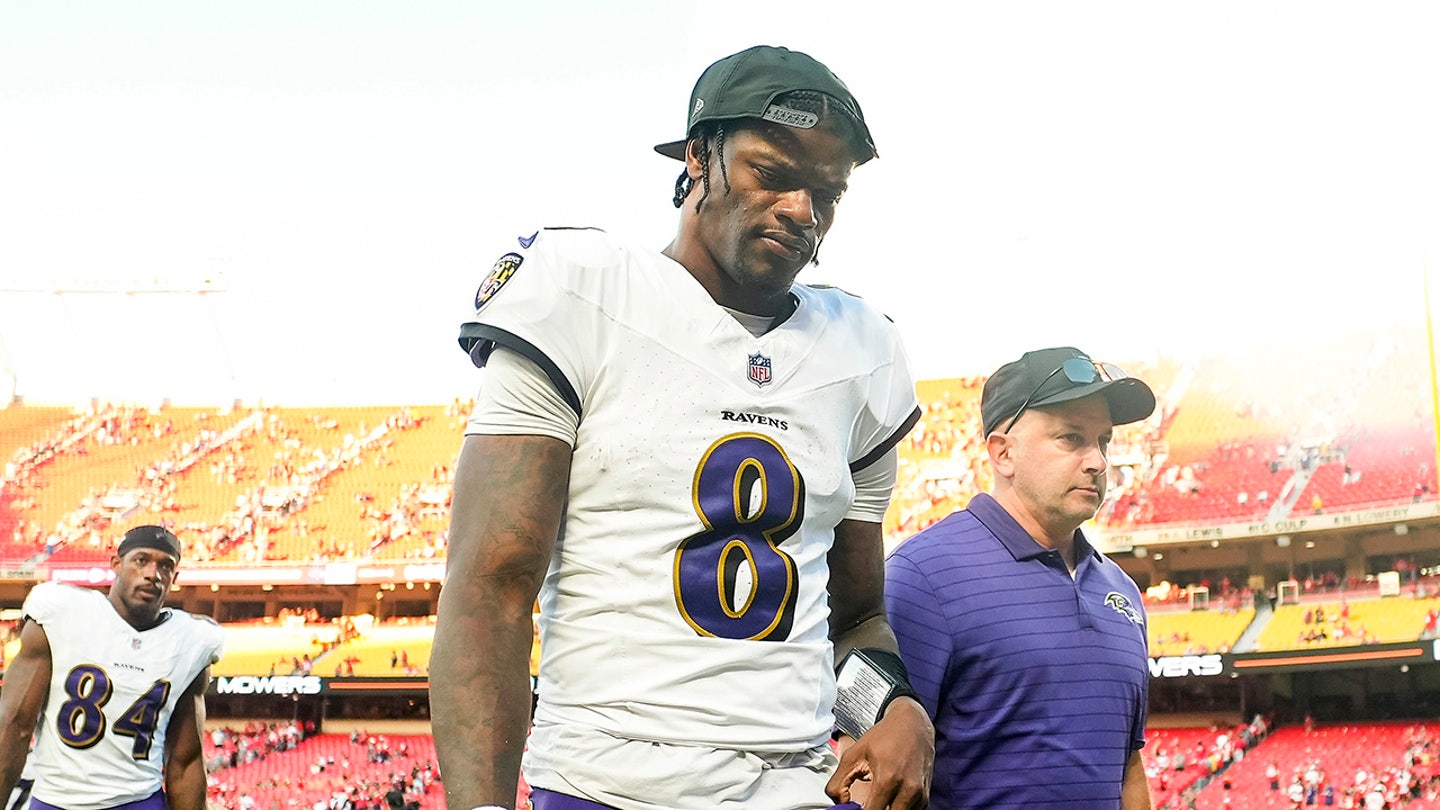 Baltimore Ravens Quarterback Lamar Jackson (8) leaves the field after a game against Kansas City Chiefs at Geha Field at Arrowhead Stadium in Kansas City, Missouri, on September 28, 2025. (Jay BiggerStaff/Imag images)