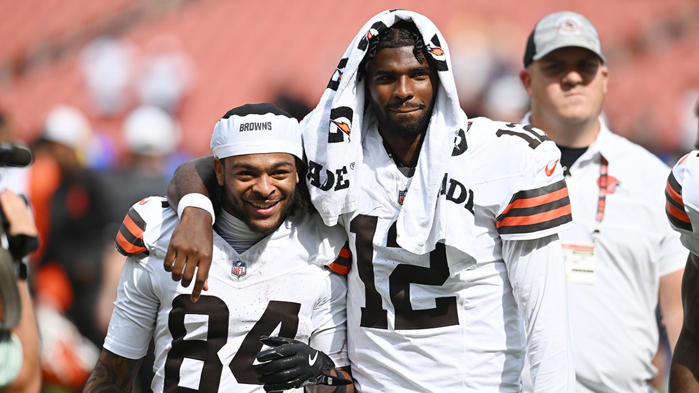 Cleveland Brown’s wide receives Gage Larvadain (84) and Quarterback Shedeur Sanders (12) goes off the field after the game between Browns and Los Angeles Rams at Huntington Bank Field. (Ken Blaze/IMAGN -Pictures)