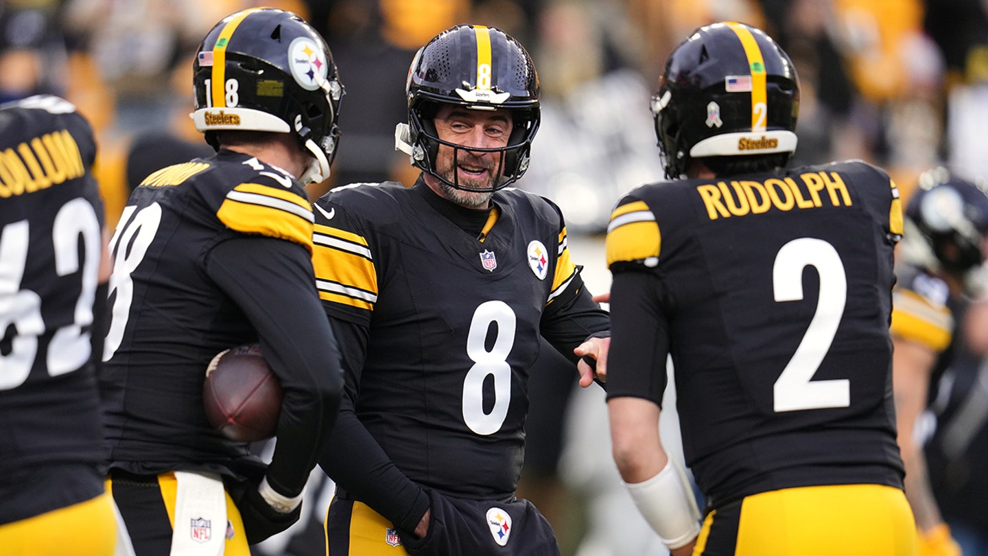 Pittsburgh Steelers quarterback Aaron Rodgers (8) talks with quarterback Will Howard (18) and quarterback Mason Rudolph (2) before an NFL football game against the Buffalo Bills, Sunday, Nov. 30, 2025, in Pittsburgh. (AP Photo/Gene J. Puskar)