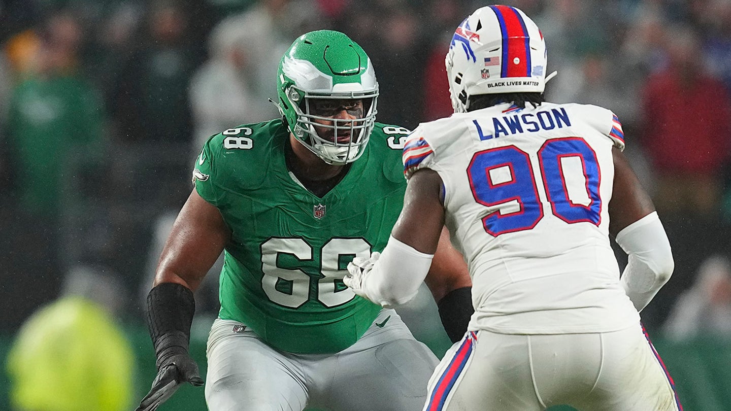 Jordan Mailata #68 of the Philadelphia Eagles blocks Shaq Lawson #90 of the Buffalo Bills at Lincoln Financial Field on November 26, 2023 in Philadelphia, Pennsylvania. (Mitchell Leff/Getty Images)