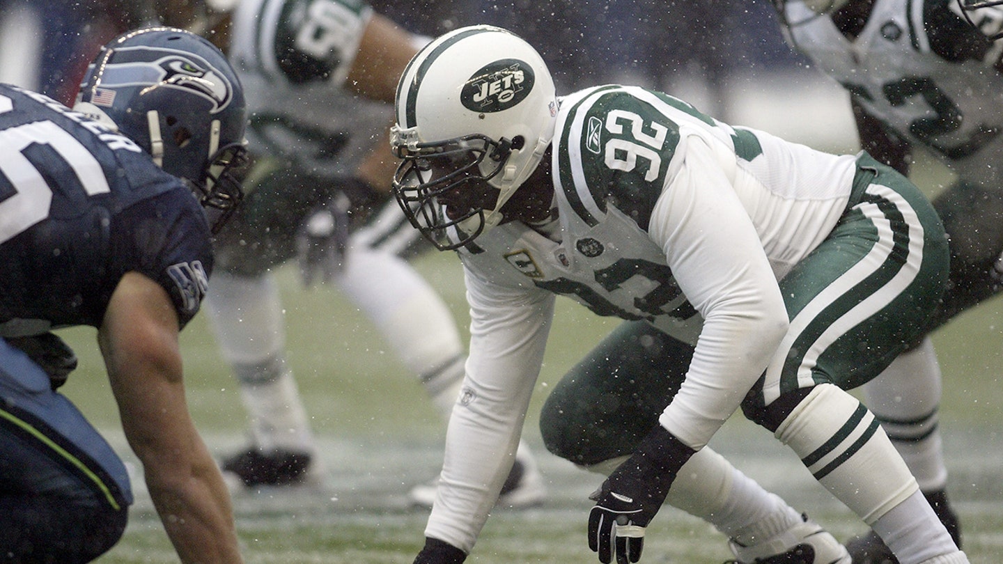 New York Jets defensive end #92 Shaun Ellis is tackled against the Seattle Seahawks at Quest Field in Seattle on December 21, 2008 (Jesse Beals/Icon SMI/Icon Sport Media via Getty Images)