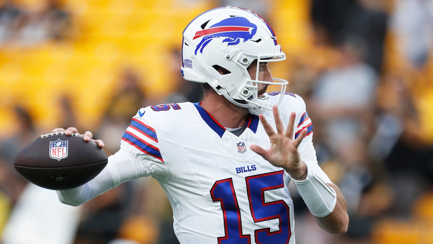 Buffalo Bills Quarterback Ben Dinucci (15) warms up on the field before a game against Pittsburgh Steelers at Acrisure Stadium. (Charles Leclaire/USA Today Sports)