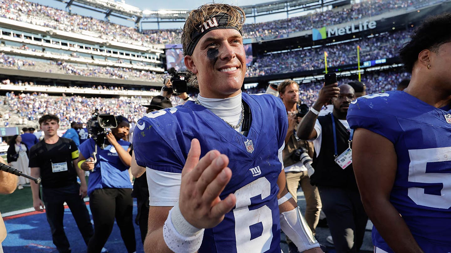 New York Giants Quarterback Jaxson Dart (6) greets players on the field after defeating Los Angeles Chargers in an NFL football match, Sunday 28 September 2025, in East Rutherford, New Jersey. (AP Photo/Adam Hunger)