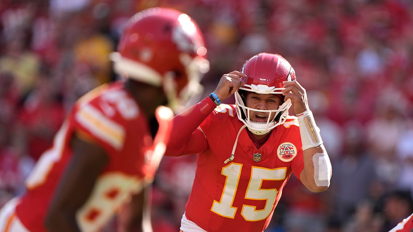 Kansas City Chiefs Quarterback Patrick Mahomes calls the line with review during the first half of an NFL football match against Baltimore Ravens Sunday 28 September 2025 in Kansas City, Missouri. (AP Photo/Charlie Riedel)