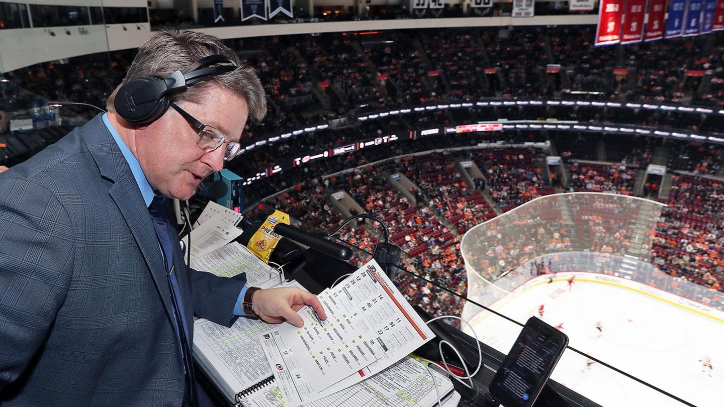 Tim Saunders, radio announcer for the Philadelphia Flyers, calls an NHL game against the Carolina Hurricanes at the Wells Fargo Center in Philadelphia, Pennsylvania on January 3, 2019. (Len Redkoles/NHLI via Getty Images)