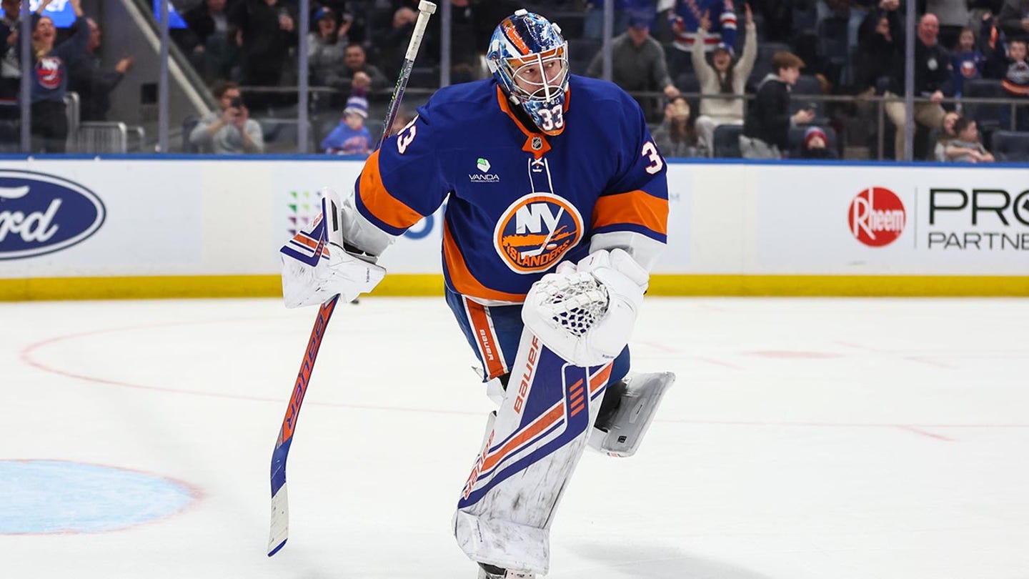 New York Islanders goalie David Rittich (33) skates away from the net after making a penalty save on a field goal attempt in the third period against the New York Rangers at UBS Arena on Dec. 27, 2025 (Wendell Cruz/Imagn Images)