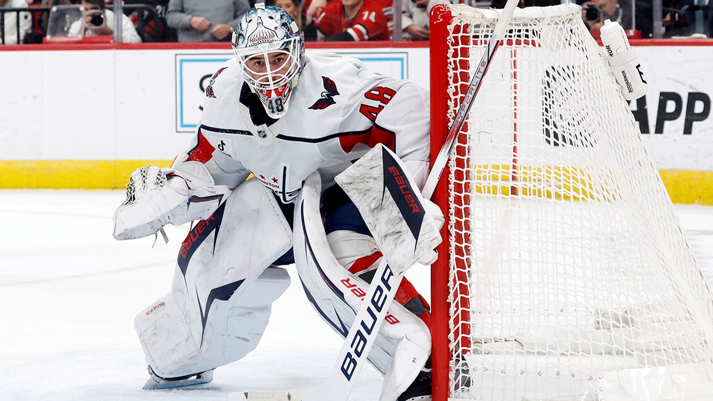 Washington Capitals goaltender Logan Thompson (48) watches the puck against the Carolina Hurricanes during the second period of an NHL hockey game in Raleigh, North Carolina, Tuesday, Nov. 11, 2025. (AP Photo/Karl DeBlaker)