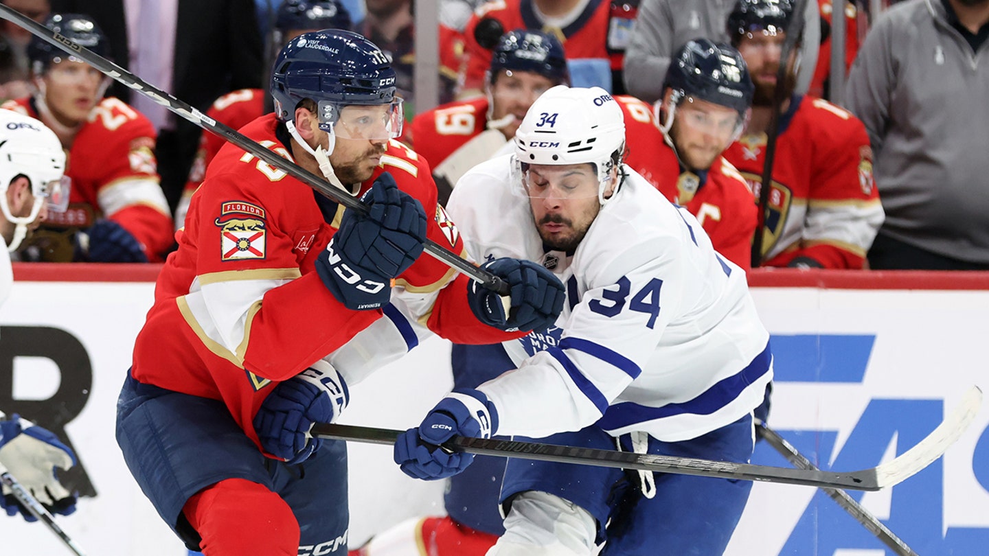 Florida Panthers Center Sam Reinhart (13) and Toronto Maple Leafs Center Auston Matthews (34) Skate in the second period in the game four of the second round of 2025 Stanley Cup Playoffs in the Amerant Bank Arena. (Kim Klement Neitzel-Preferred Pictures)