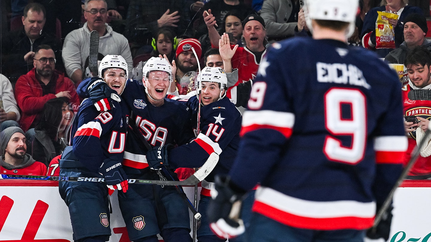 Team USA forward Brady Tkachuk (7) celebrates with his teammates his goal against Team Finland in the third period during a 4 Nations Face-Off ice hockey game at the Bell Centre. (David Kirouac/Imagn Images)