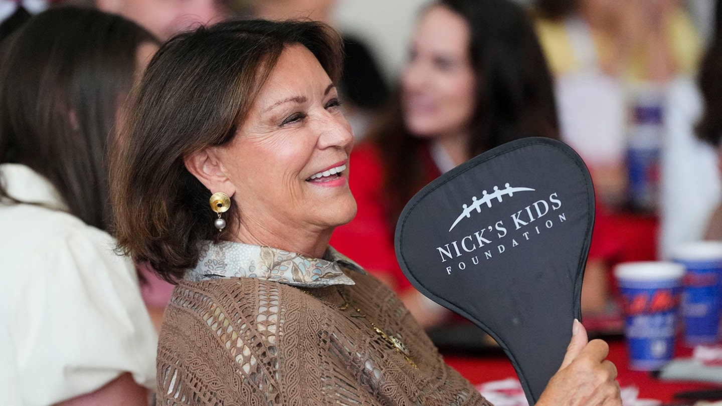 Terry Saban smiles as her husband, legendary football coach Nick Saban talks about how she “conspires” to spend money on foundation business during the Nick’s Kids Foundation Luncheon at Bryant-Denny Stadium on August 5, 2025. (Gary Cosby Jr. / USA TODAY NETWORK via Imagn Images)