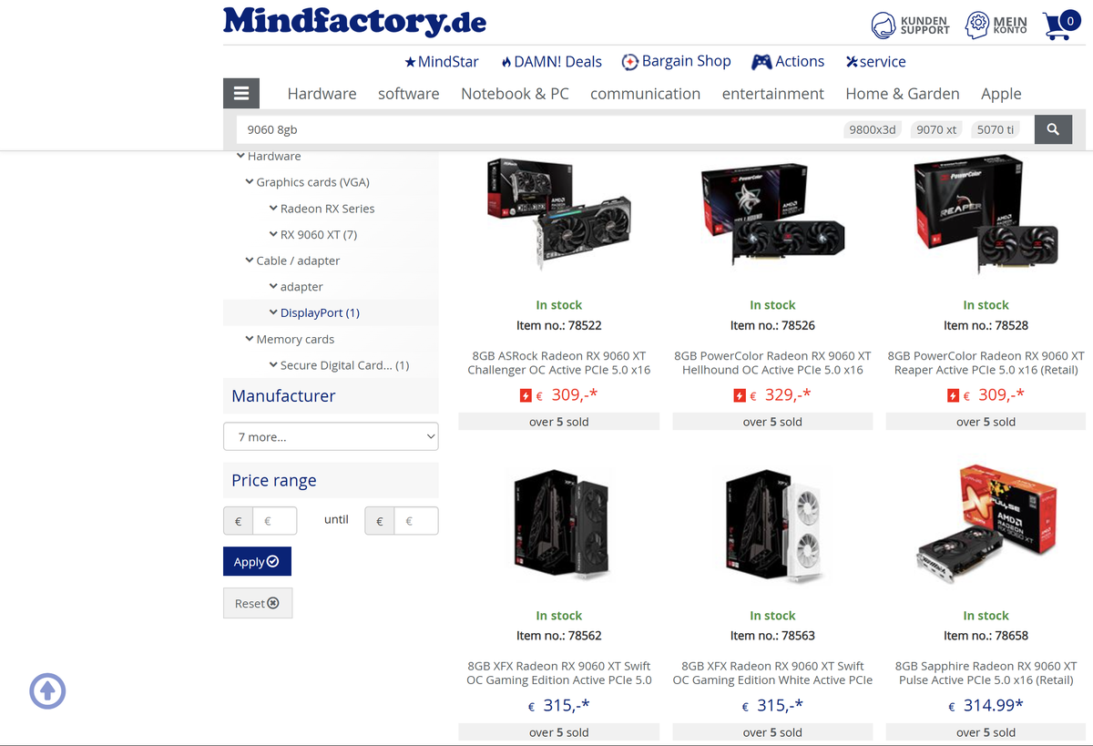 As reported by WCCFTECH, a German retailer, Mindfactory, has a low number of devices sold on NVIDIA RTX 5060 TI (8 GB), and AMD Radeon RX 9060 XT (8 GB), noticeably less than their 16 GB resistance – this is thanks to the retailer showing how many units have been sold on each product.