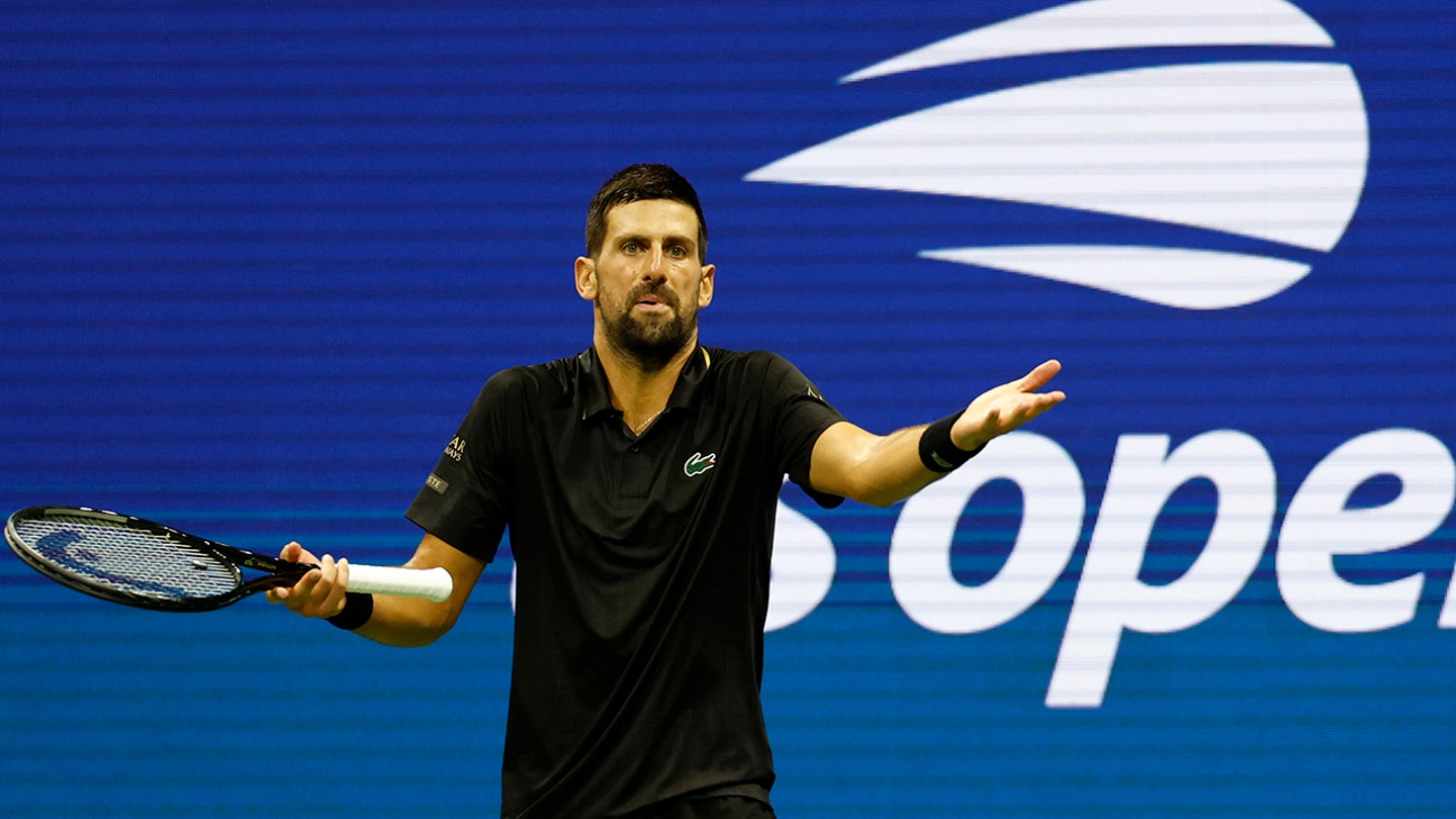 Novak Djokovic moves to the crowd during a match against Taylor Fritz (not depicted) on Day 10 in the US Open at Billie Jean King National Tennis Center on September 2, 2025. (GEOFF BURKE/ IMAGN -PICTURES)