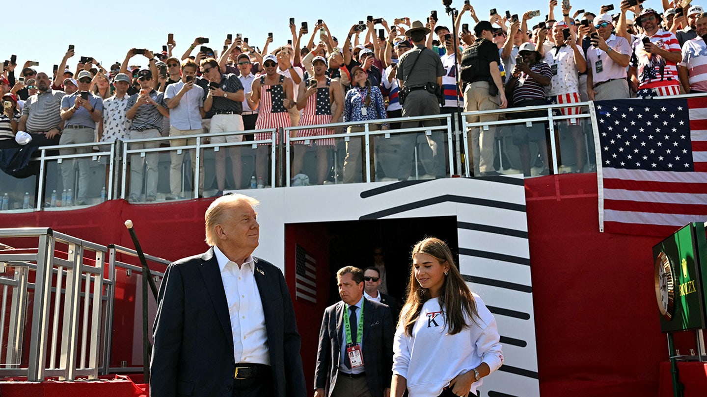 US President Donald Trump and his grandson Kai Madison Trump participate in the 45th Ryder Cup Golf Competition at Bethpage Black Course in Farmingdale, New York, on September 26, 2025. (Mandel Ngan/Pool/AFP via Getty Images)