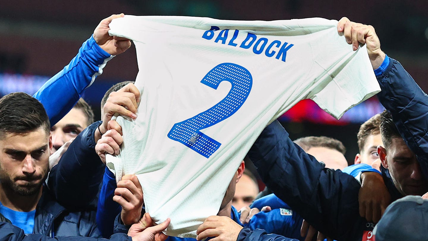 The Greece players stop a shirt bearing George Baldock’s name and number after their victory over England during the UEFA Nations League 2024/25 League B Group B2 match between England and Greece at Wembley Stadium on October 10, 2024 in London. (Charlotte Wilson/Offside/Offside via Getty Images)